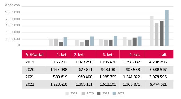 Udviklingen i passagertal 2019-2022 opgjort kvartalsvis