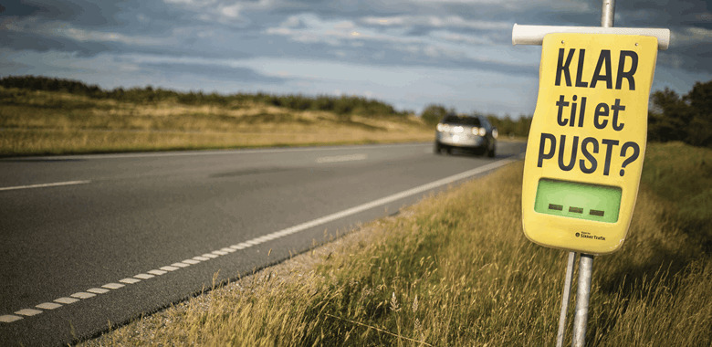 Når du hen over sommeren kører på vejene i Odder Kommune, vil du af og til møde et gult skilt i vejsiden, der ligner en af politiets alkometre, hvor der står “Klar til et pust?”.