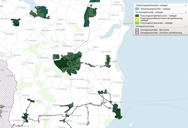 Foto: PR // Ligger din bolig inden for det mørkegrønne eller grønt skraverede felt, er der fjernvarme eller planer om det i området, og puljen kan derfor ikke søges. Er boligen derimod i det gule, grønne eller lilla skraverede område, kan puljen søges.